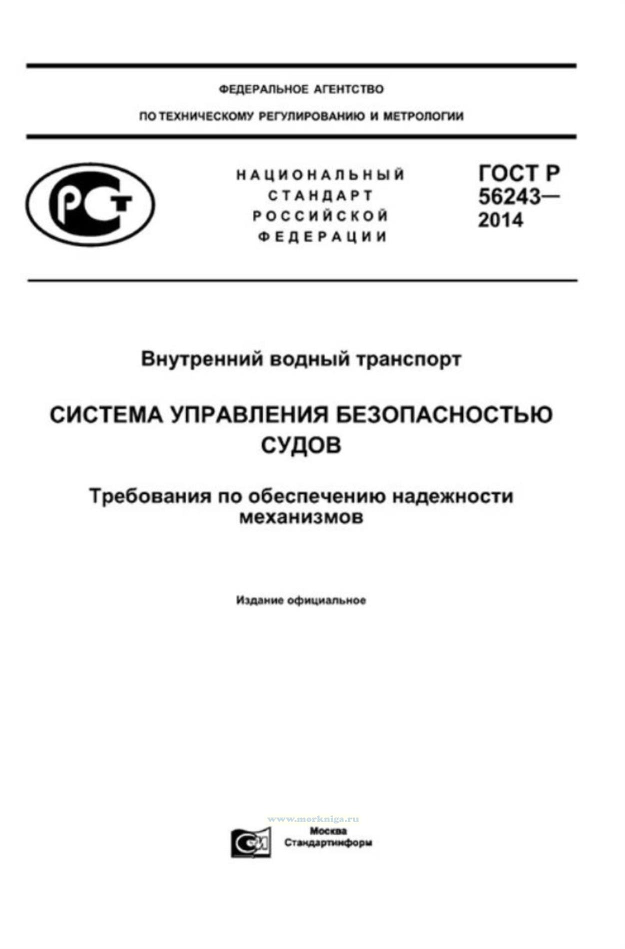 ГОСТ Р 56243-2014 "Внутренний водный транспорт. Система управления безопасностью судов. Требования по обеспечению надежности механизмов" утв. Приказом Федерального агентства по техническому регулированию и метрологии от 19 ноября 2014 г. N 1682-ст