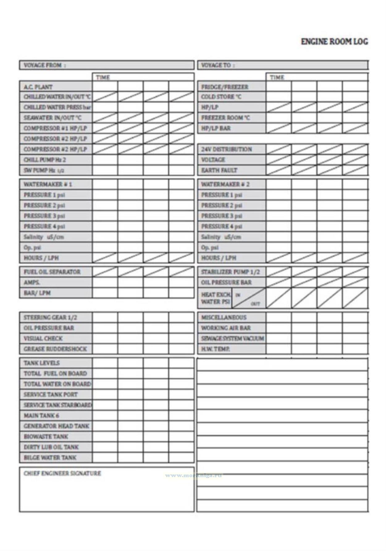 An engine room logbook is a track record of all ship machinery parameters, performance, maintenance, and malfunctions. The recorded values and information are used as a reference, to compare and record data to assess the ongoing performance of different engine room machinery.