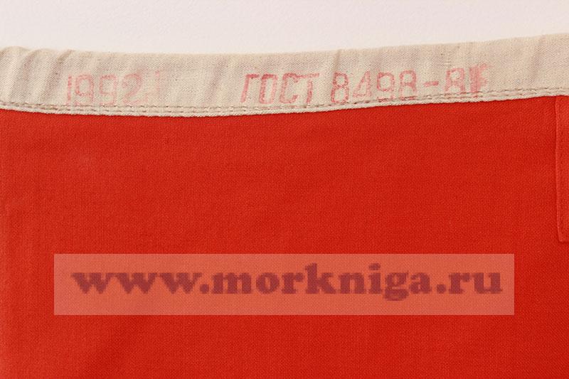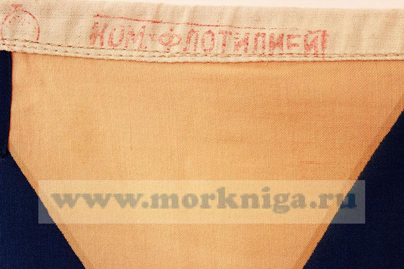 На брезентовой полоске надпись: Ком. флотилией, 1992 г. ГОСТ 8498-81 Флаги и вымпелы специальные. Общие технические условия.