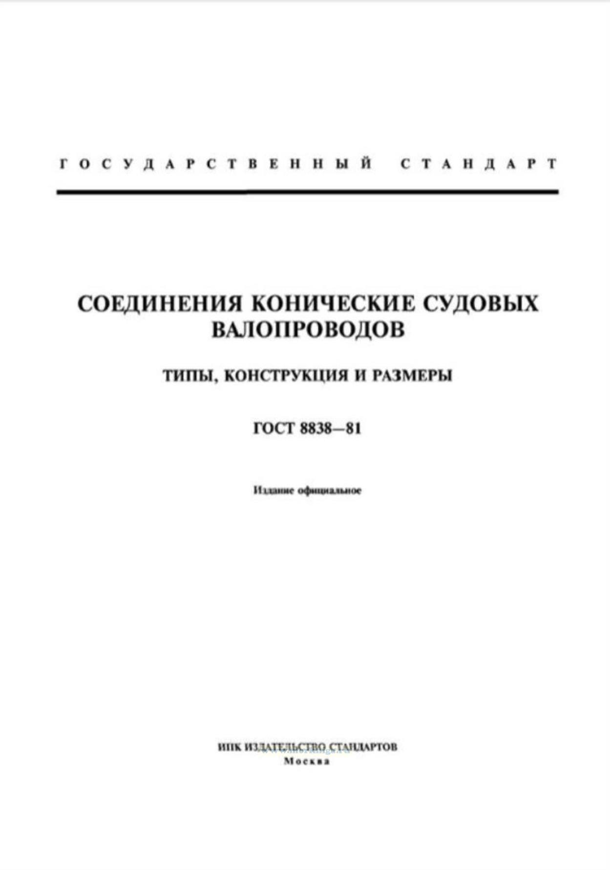 ГОСТ 8838-81 "Соединения конические судовых валопроводов. Типы, конструкция и размеры" утвержден и введен в действие Постановлением Государственного комитета СССР по стандартам от 28.09.81 № 4407.
