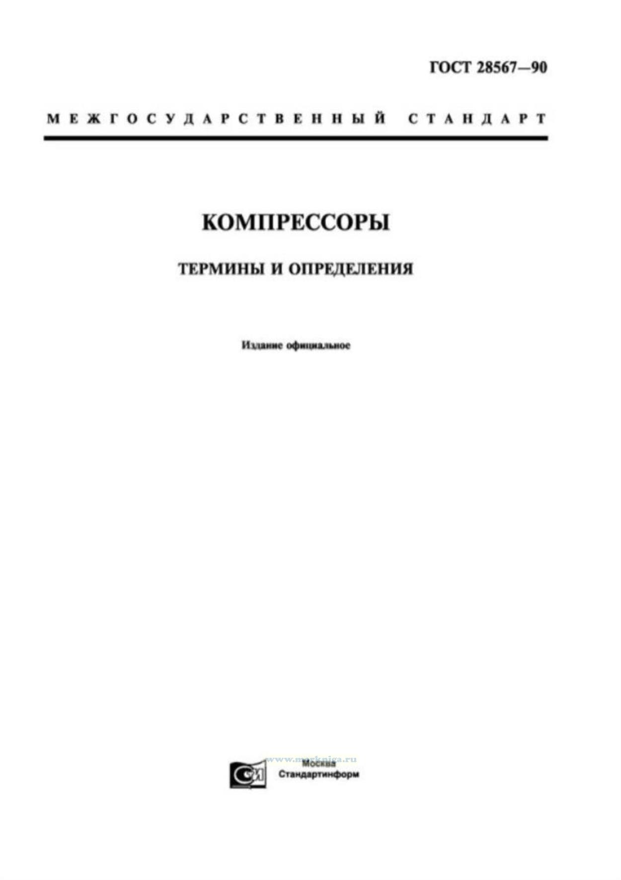 ГОСТ 28567-90 "Компрессоры. Термины и определения" утв. Постановлением Государственного комитета СССР по управлению качеством продукции и стандартам от 30.05.90 № 1346.