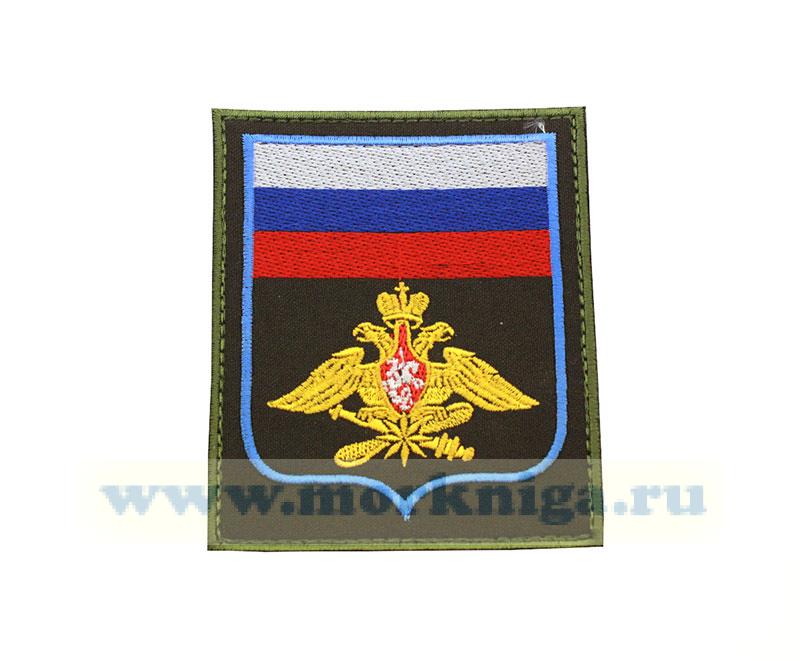 Средняя эмблема Военно-воздушных сил: изображение золотого двуглавого орла с распростертыми крыльями, держащего в лапах перекрещенные пропеллер и зенитную пушку; на груди орла - красный, треугольный, вытянутый книзу щит со штоком, восходящим к короне; в поле щита - всадник, поражающий копьем дракона".