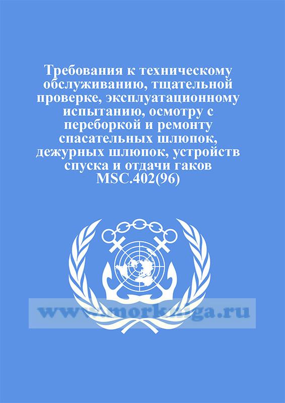Параллельный англо-русский текст Резолюции MSC.402(96) с корректурой. Требования к техническому обслуживанию, тщательной проверке, эксплуатационному испытанию, осмотру с переборкой и ремонту спасательных шлюпок, дежурных шлюпок, устройств спуска и отдачи гаков включена в Сборник № 55 резолюций ИМО/ Collection No.55 of IMO Resolutions