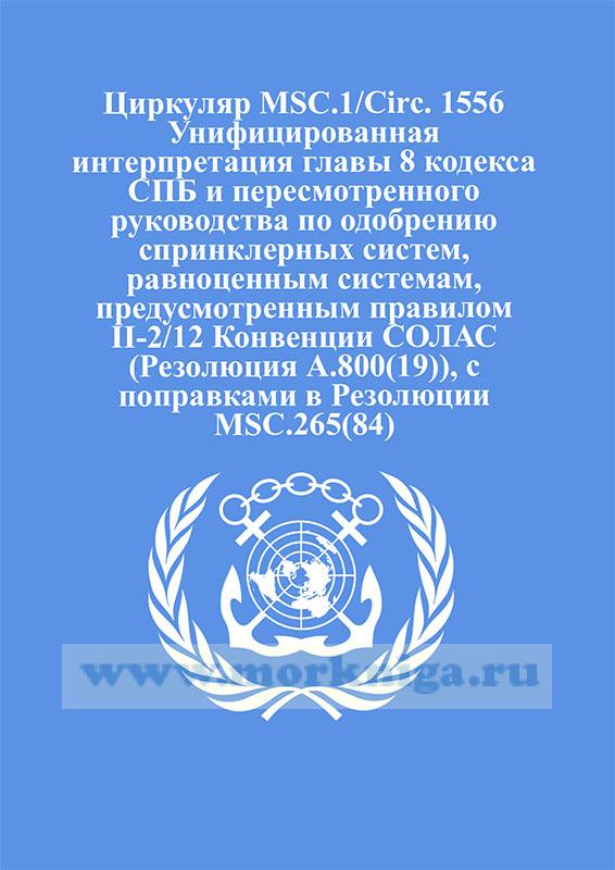 Циркуляр MSC.1/Circ. 1556 Унифицированная интерпретация главы 8 кодекса СПБ и пересмотренного руководства по одобрению спринклерных систем, равноценным системам, предусмотренным правилом II-2/12 Конвенции СОЛАС (Резолюция А.800(19)), с поправками в Резолюции MSC.265(84) включена в Сборник № 56 резолюций ИМО/ Collection No.56 of IMO Resolutions.