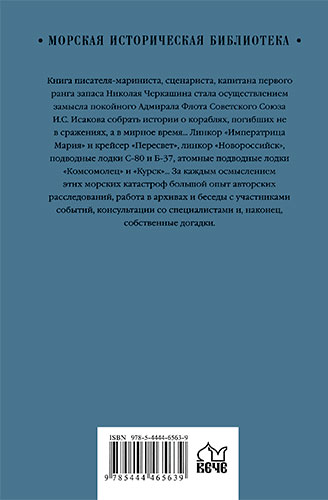 В книге известного писателя-мариниста Николая Черкашина реализован неосуществленный замысел Адмирала Флота Советского Союза Ивана Степановича Исакова, который хотел собрать истории о кораблях, погибших не в сражениях, а в мирное время. Если покойный адмирал собирался это сделать на материале царского и иностранных флотов, то жизнь представила нашему автору возможность поразмышлять над недавними трагедиями советского и российского флотов.