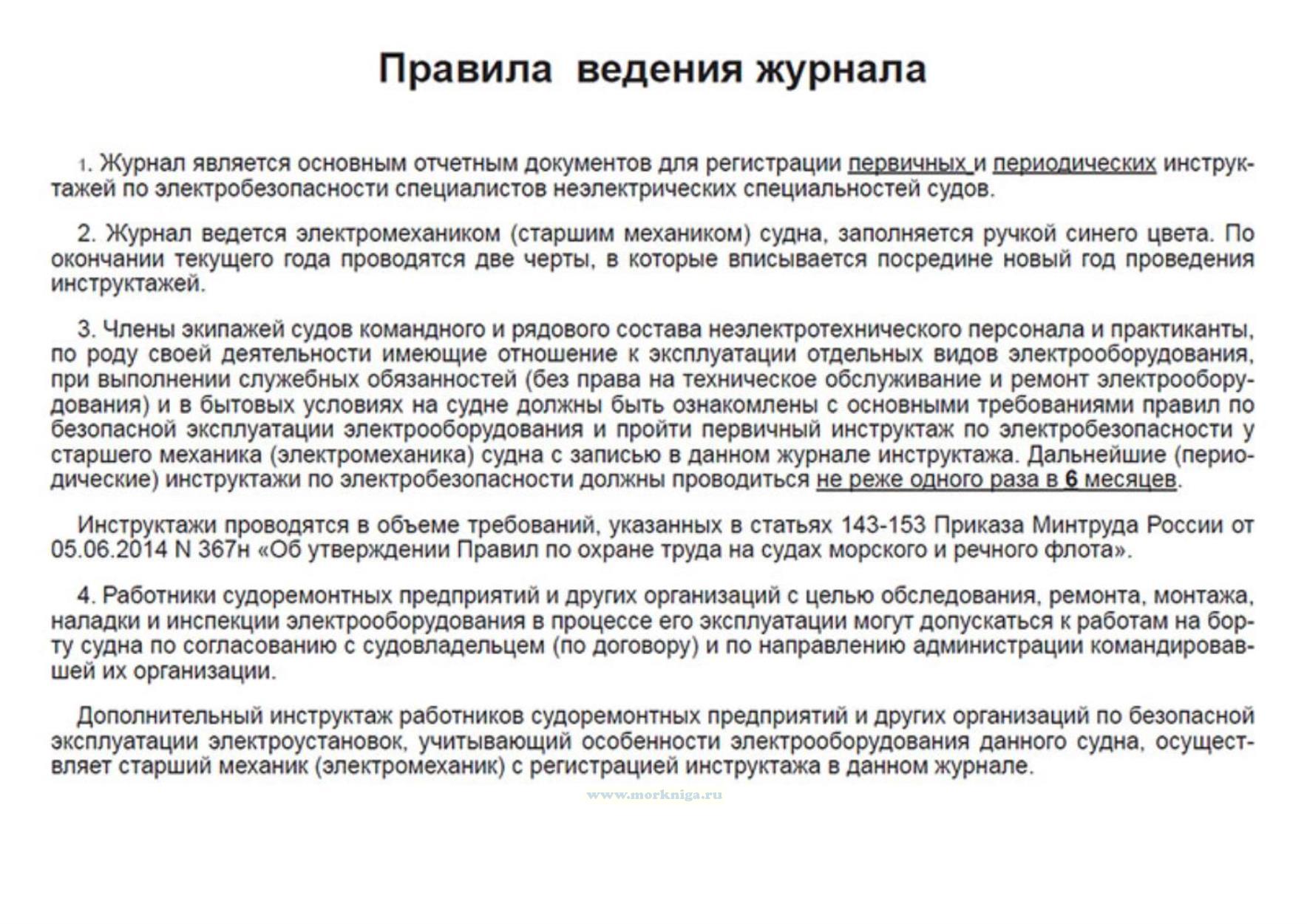 1. Журнал является основным отчетным документов для регистрации первичных и периодических инструктажей по электробезопасности специалистов неэлектрических специальностей судов.