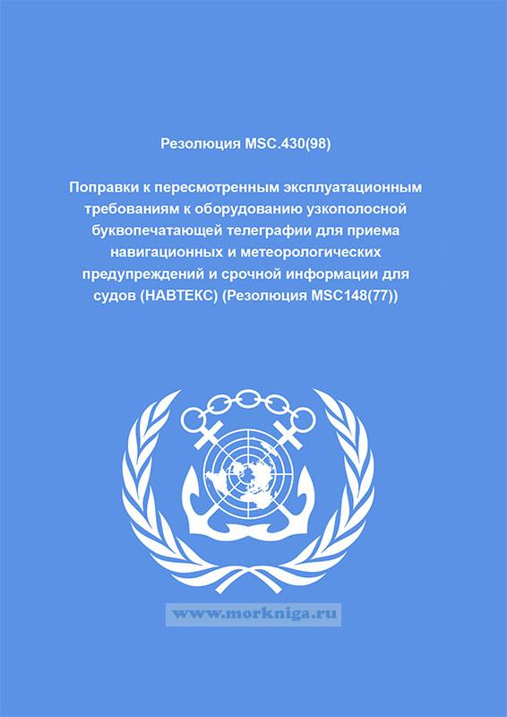 Резолюция MSC.430(98) Поправки к пересмотренным эксплуатационным требованиям к оборудованию узкополосной буквопечатающей телеграфии для приема навигационных и метеорологических предупреждений и срочной информации для судов (НАВТЕКС) (Резолюция MSC148(77)) включена в Сборник № 57 резолюций ИМО/ Collection No.57 of IMO Resolutions.