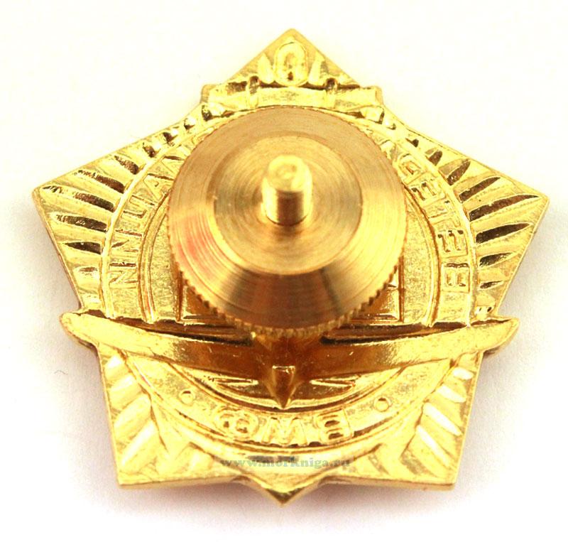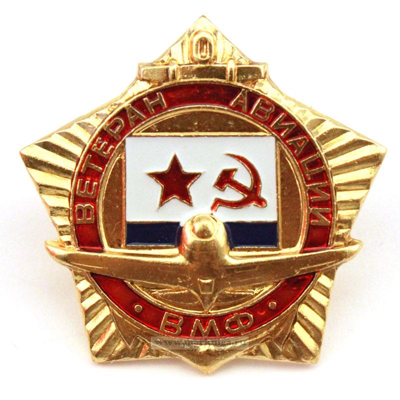 Знак изготовлен из металла золотистого цвета, выпущен в форме пятиконечной звезды, по центру красный круг, на нем выполнена надпись «Ветеран авиации ВМФ». В нижней половине знака объемное изображение самолета, а над ним флаг ВМФ СССР.