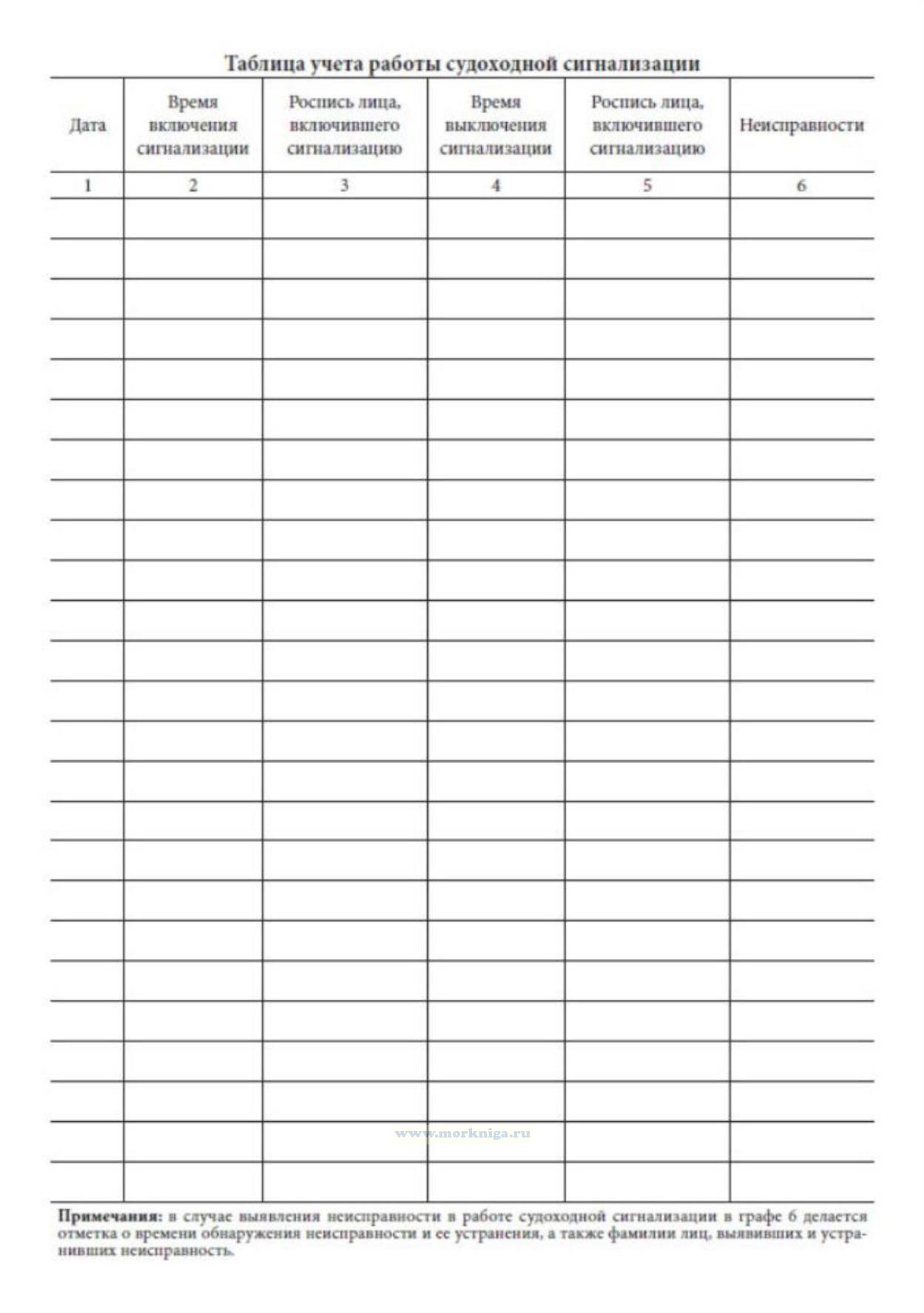 Таблица учета работы судоходной сигнализации: