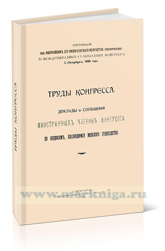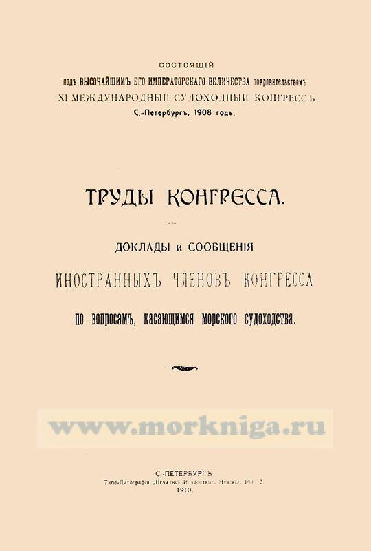 С 18 по 25 мая 1908 г. в С.-Петербурге состоялся XI Международный Судоходный Конгресс. На Конгрессе было представлено 95 докладов и сообщений по различным вопросам программы, из которых 41 составлены русскими членами Конгресса, и 54 иностранными членами Конгресса.