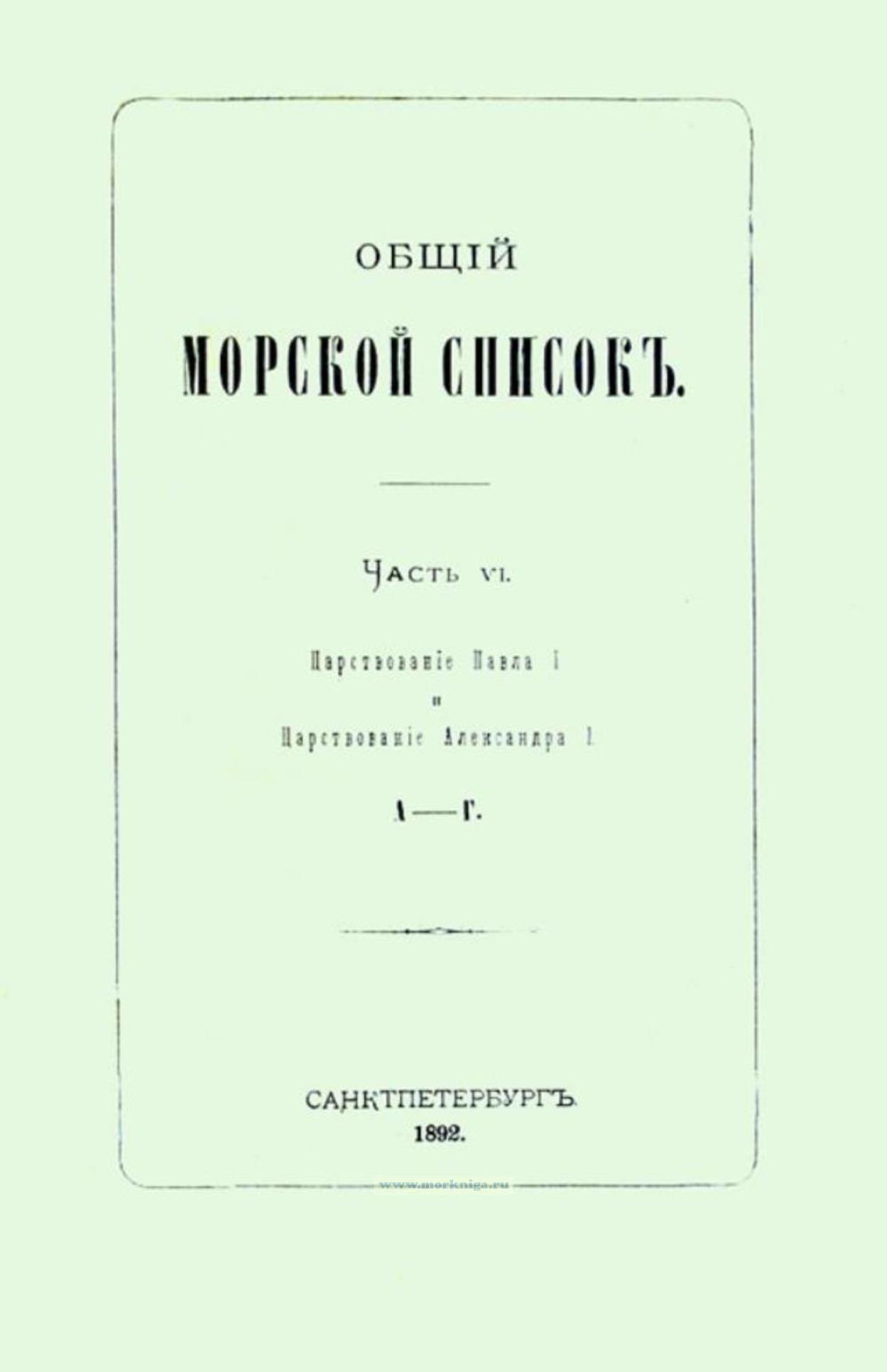 В VI части «Общего Морского Списка» заключаются сведения о служебной деятельности морских чинов, получивших офицерское звание, или принятых в службу этими званиями в царствование Императора Павла I и части в царствование Императора Александра I. Исключение представляет Дмитрий Павлович Примо, (стр. 182), произведенный в офицеры в царствование Екатерины II, но в IV части «Списка» пропущенный.