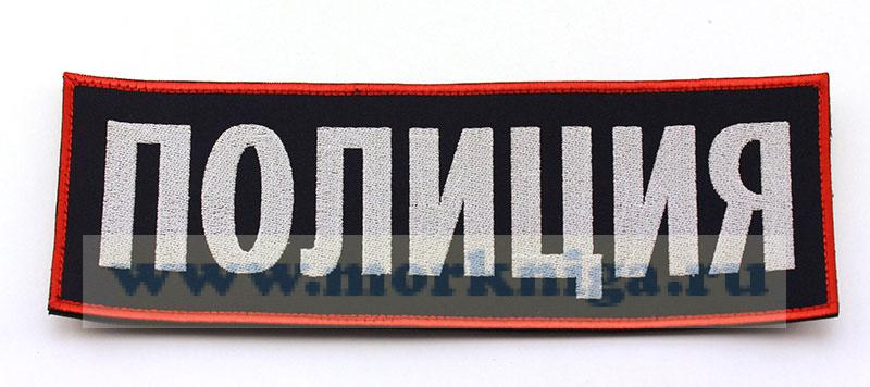Нашивка на спину вышитая Полиция. Фон темно синий, кант красный. Размер: длина 26,2 см, ширина 8,3 см.