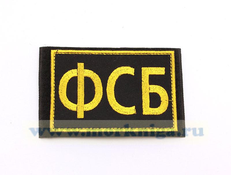 Нашивка вышитая "ФСБ" прямоугольной формы, на липучке. Фон черный, кант желтый, буквы желтые. Размер: длина 8,7 см, ширина 5,8 см.