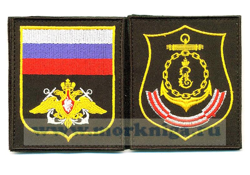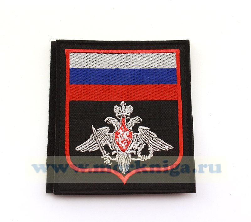 Нашивка вышитая нарукавная МО РФ прямоугольной формы. Фон черный, кант красный. Размер: длина 10 см, ширина 8,5 см.
