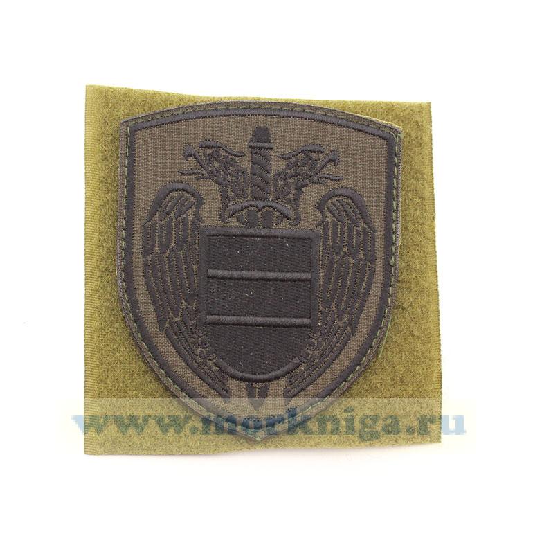 Нашивка вышитая нарукавная "Щит Федеральной службы охраны", фон оливковый, кант черный, вышивка черного цвета. Размер: длина 9,5 см, ширина 8 см.