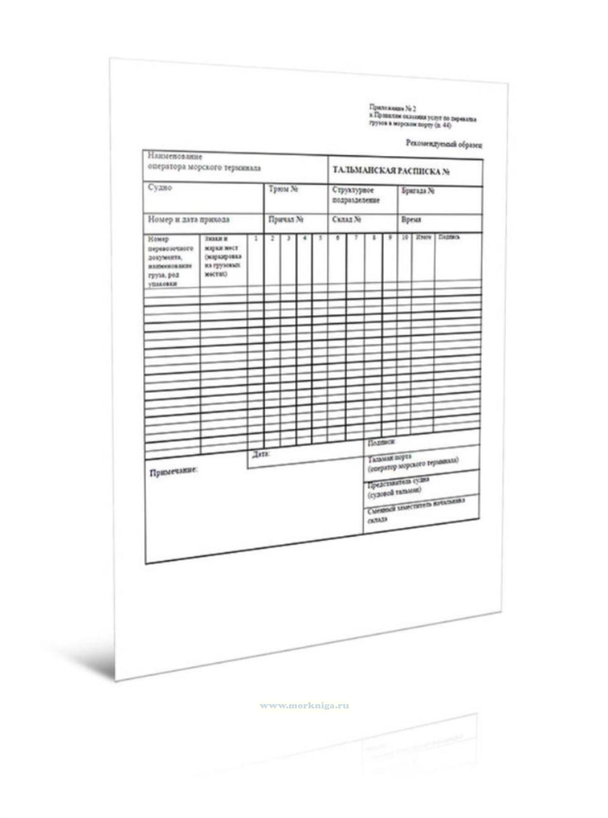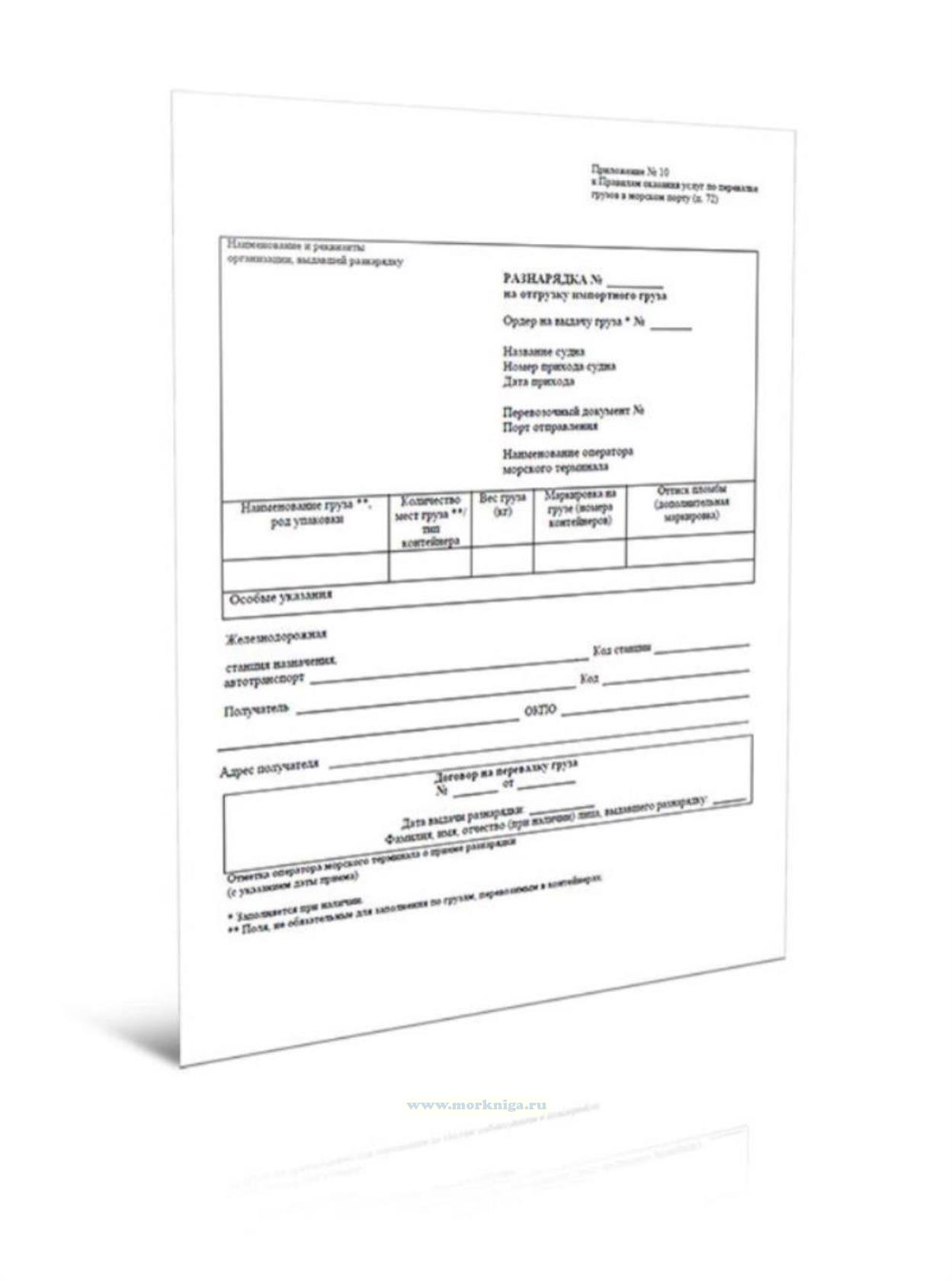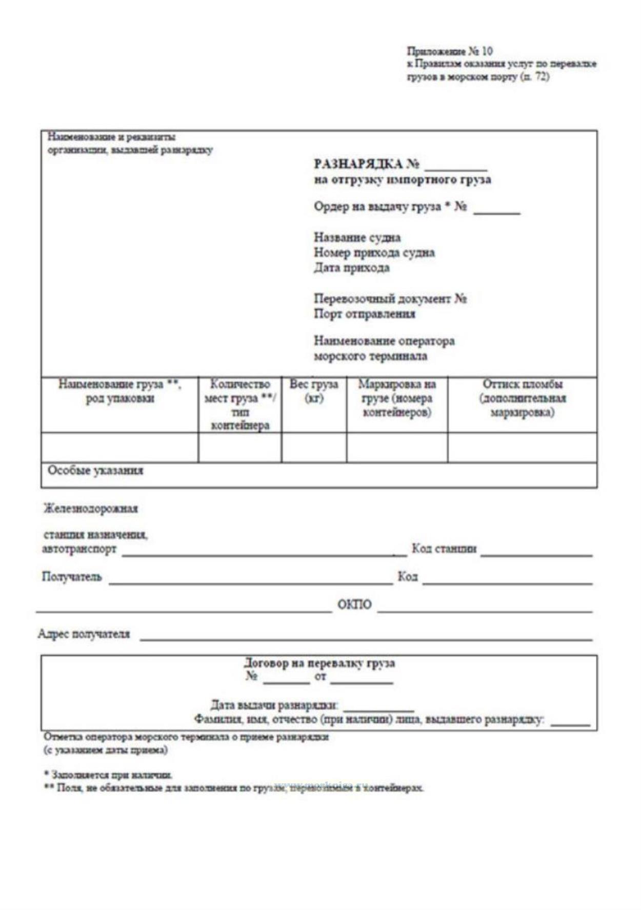Форма разнарядки на отгрузку импортного груза соответствует приложению №10 к Правилам оказания услуг по перевалке грузов в морском порту.