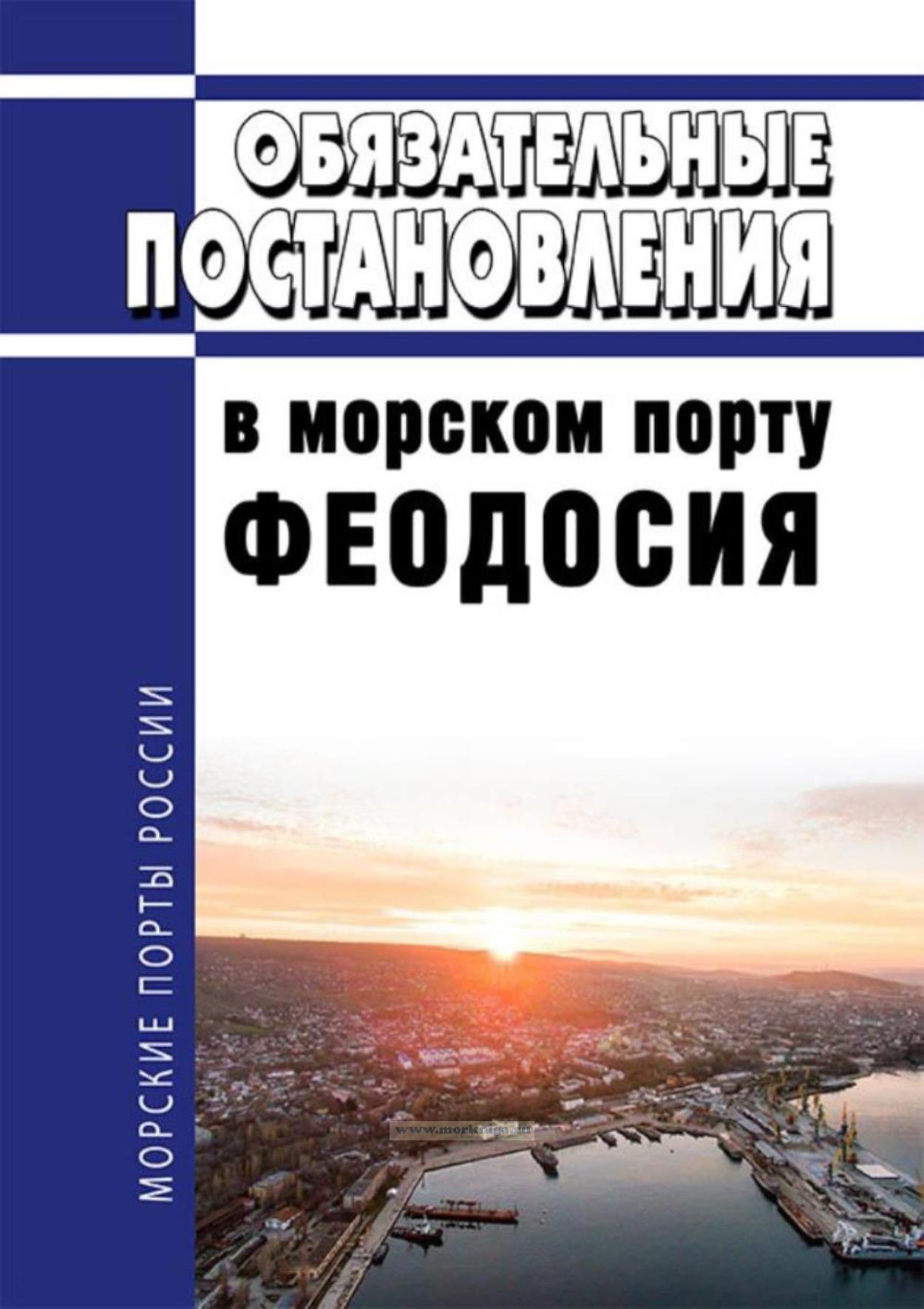 Обязательные постановления в морскому порту Феодосия разработаны в соответствии с Федеральным законом от 8 ноября 2007 г. N 261-ФЗ О морских портах в Российской Федерации и о внесении изменений в отдельные законодательные акты Российской Федерации, Федеральным законом от 30 апреля 1999 г. N 81-ФЗ Кодекс торгового мореплавания Российской Федерации, Общими правилами плавания и стоянки судов в морских портах Российской Федерации и на подходах к ним).