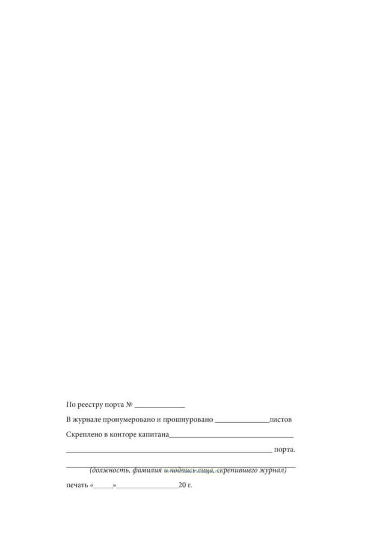 Все листы в машинном журнале должны быть пронумерованы, прошнурованы и скреплены на последней странице печатью капитана бассейна внутренних водных путей Российской Федерации.
