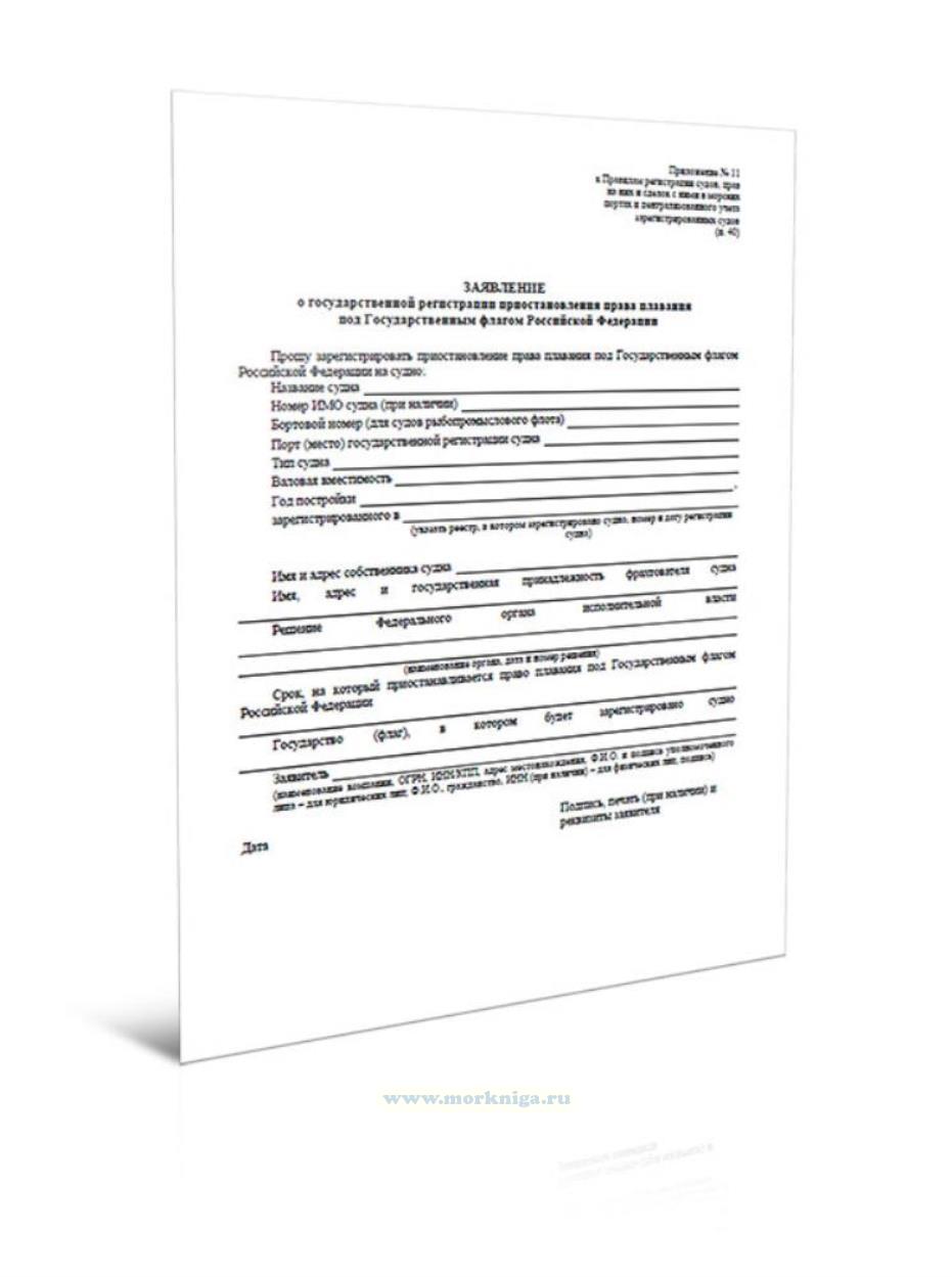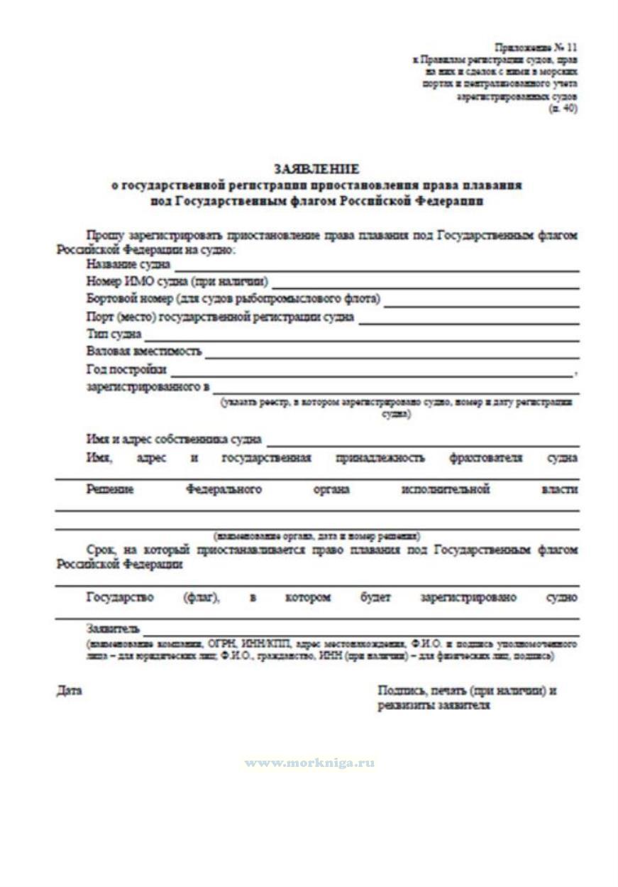 Форма заявлениея о государственной регистрации приостановления права плавания под Государственным флагом Российской Федерации соответствует приложению №11 к Правилам государственной регистрации судов, прав на них и сделок с ними в морских портах и централизованного учета зарегистрированных судов.