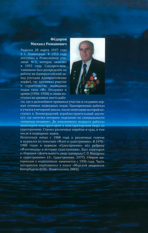 В словарь вошли биографии русских подводников, которые после Октябрьских событий 1917 г. эмигрировали за границу или остались на родине. Некоторые из них были репрессированы и погибли в ГУЛАГе. В этом издании представлены сотни фотографий ко-мандиров кораблей, героев-подводников и памятников как самим подводникам, так и под-водным лодкам. В конце каждой биографии указаны источники и литература.