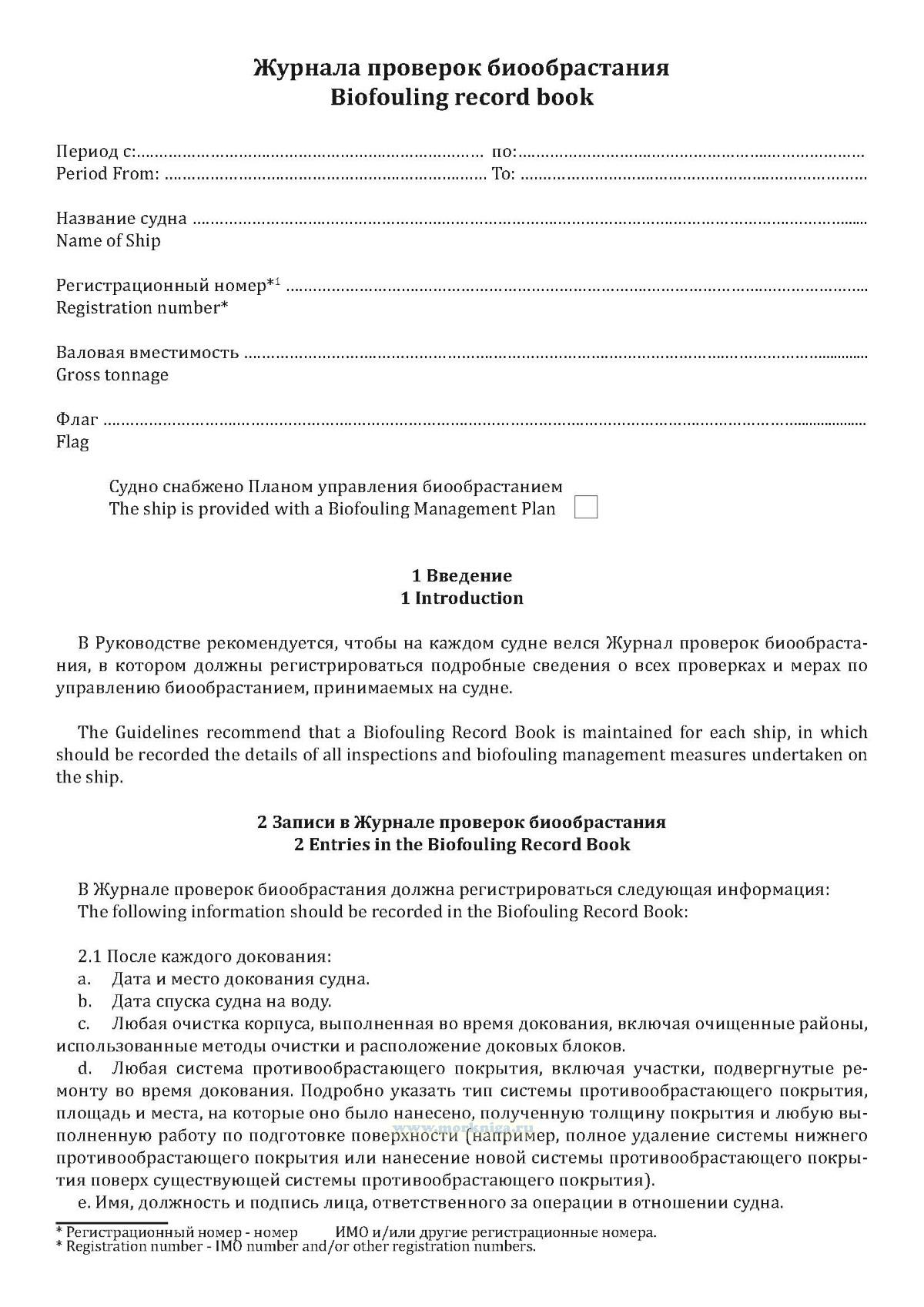 В Руководстве рекомендуется, чтобы на каждом судне велся журнал проверок биообрастания, в котором должны регистрироваться подробные сведения о всех проверках и мерах по управлению биообрастанием, принимаемых на судне.