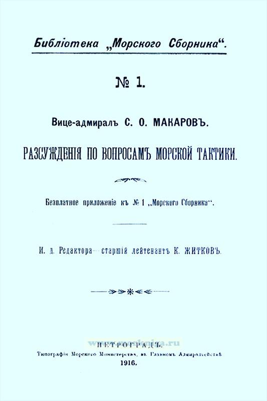 На пути из России в Артур, адмирал Макаров просил телеграммой Управляющего Морским Министерством напечатать возможно скорее его книгу "Рассуждения по вопросам морской тактики" и выслать ее на эскадру в Артур. Очевидно адмирал хотел ознакомить личный состав эскадры со своими взглядами на ведение боя, и, не имея под рукой достаточного количества экземпляров, обратился за содействием в Морское Министерство.