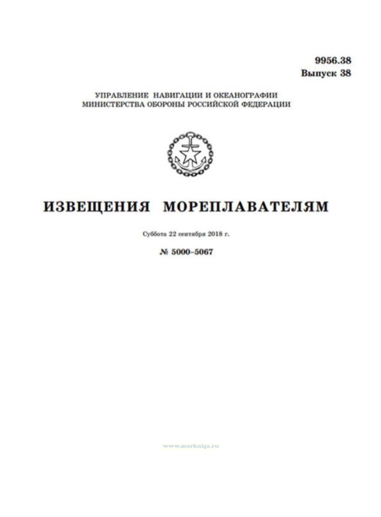 Извещения мореплавателям. Выпуск 38. № 5000-5067 (от 22 сентября 2018 г.) Адм. 9956.38