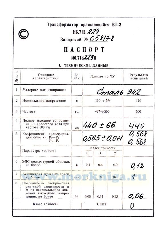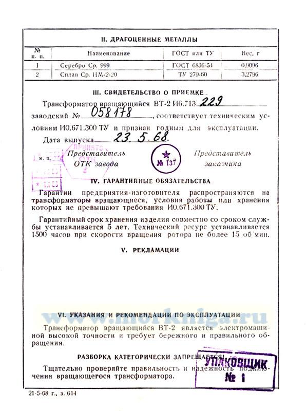 Трансформатор вращающийся ВТ-2 И6.713229, заводской № 058178 соответствует техническим условиям И0.671.300 ТУ и признан годным для эксплуатации.