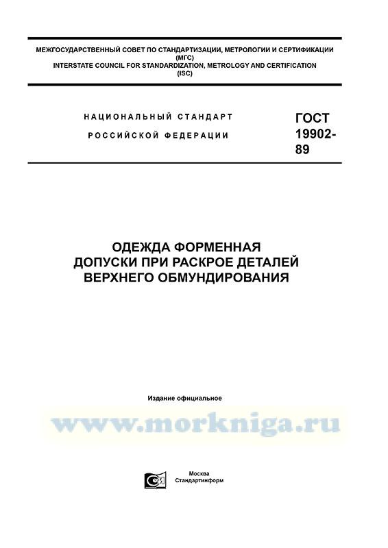 ГОСТ 19902-89 "Одежда форменная. Допуски при раскрое деталей верхнего обмундирования" утв. Постановлением Государственного комитета СССР по управлению качеством продукции и стандартам от 20.12.89 N 3911