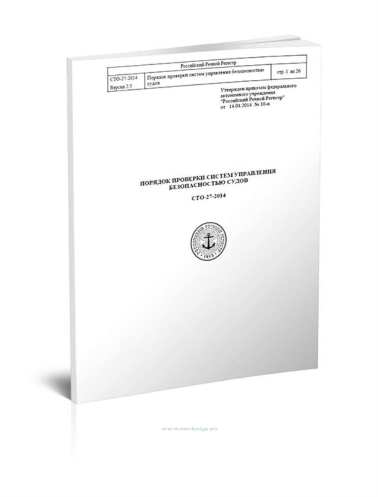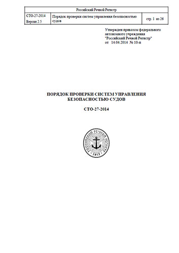 СТО-27-2014 "Порядок проверки систем управления безопасностью судов" утвержден приказом федерального автономного учреждения "Российский Речной Регистр" от 14.04.2014 № 10-п