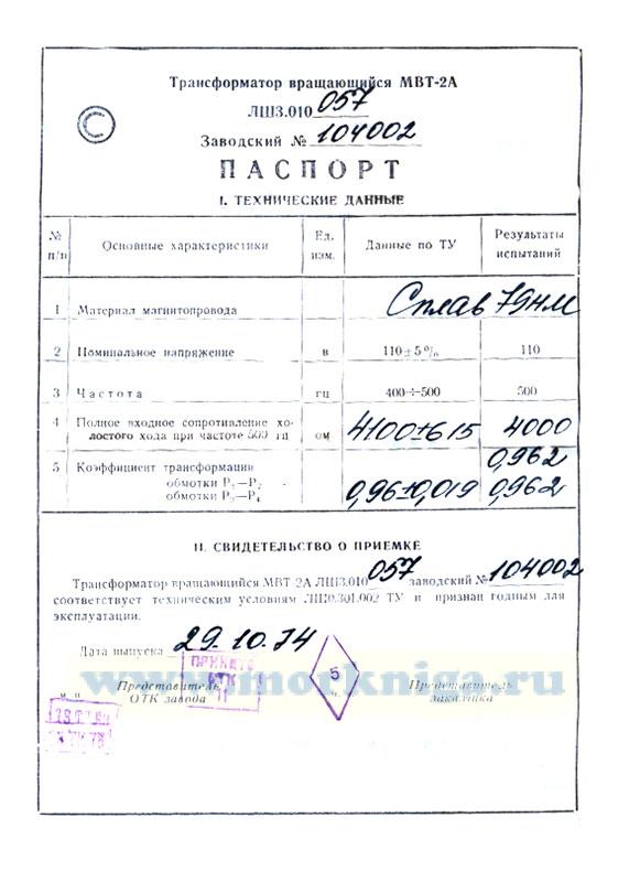 Трансформатор вращающийся МВТ-2А ЛШЗ010057, заводской № 104002 соответствует ТУ и признан годным для эксплуатации.