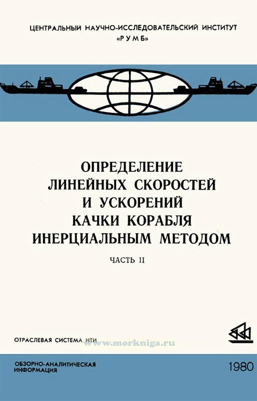 Во второй части обзора (главы 5-7) рассматриваются вопросы приборного определения линейных скоростей и ускорений качки корабля инерциальным методом. Приводятся алгоритмы для нахождения указанных кинематических параметров качки при различной ориентации измерителей ускорений. Излагаются способы определения линейных скоростей качки, основанные на интегрировании показаний измерителей ускорений или на непосредственном измерении линейных скоростей с помощью соответствующих датчиков.