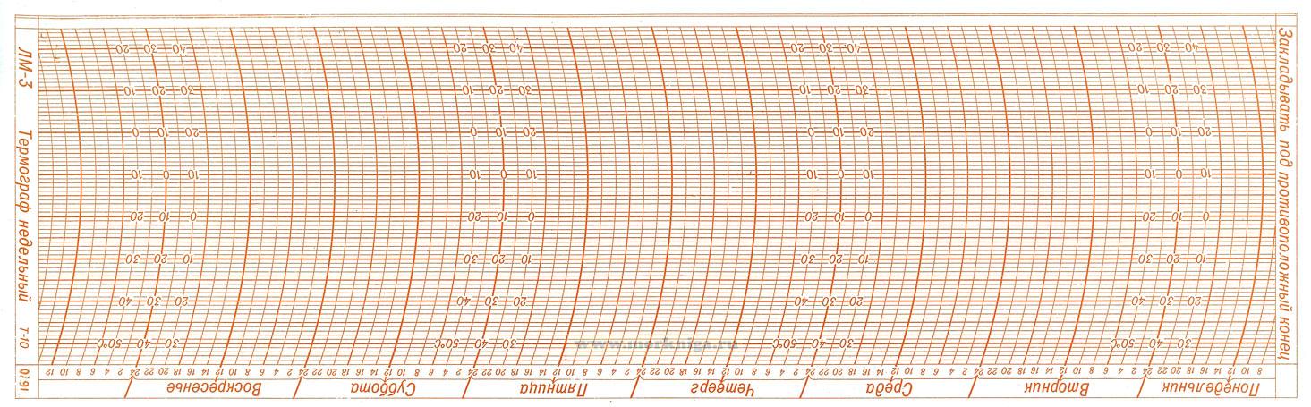 Совместимость бланков для самописцев Сафоновского завода ГИДРОМЕТПРИБОР Предназначен для записи диаграмм изменений температуры воздуха пером термографа. Тип бумаги-мелованная матовая плотностью 115 г/м2. Размеры: длина-30 см., ширина-90 мм.