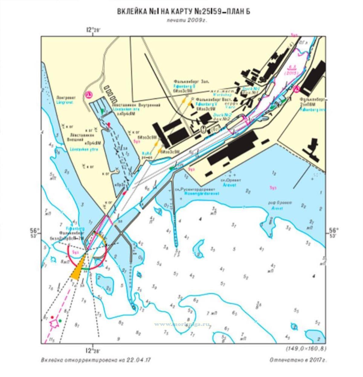 Направления створов даны двойные: первое — с берега (от заднего знака к переднему), второе — с моря. Направления границ секторов освещения в градусах даны от источника света и отсчитываются по часовой стрелке.