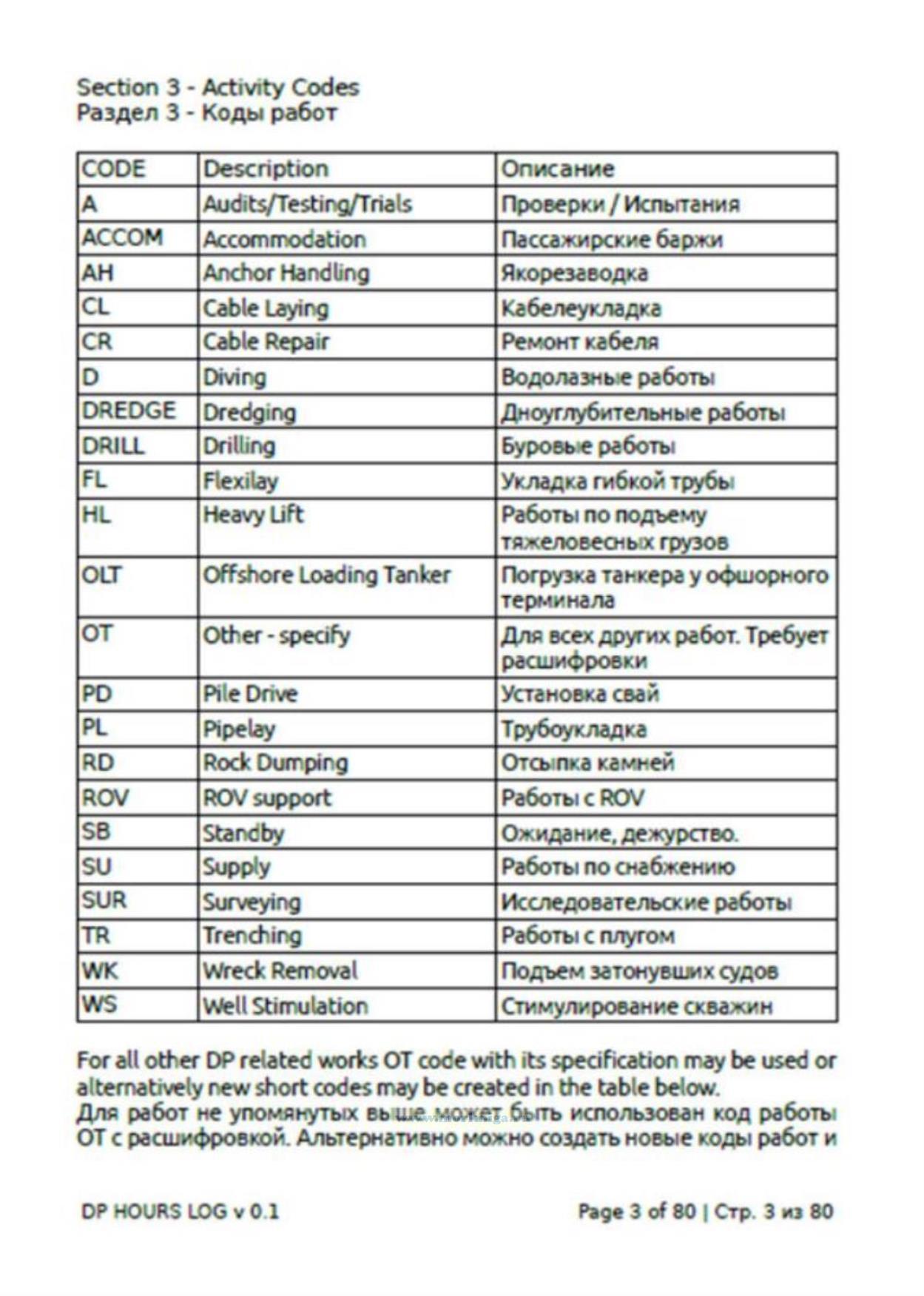 Section 3 is describing short activities codes which in general reflects NI DP Operator's Logbook short codes.