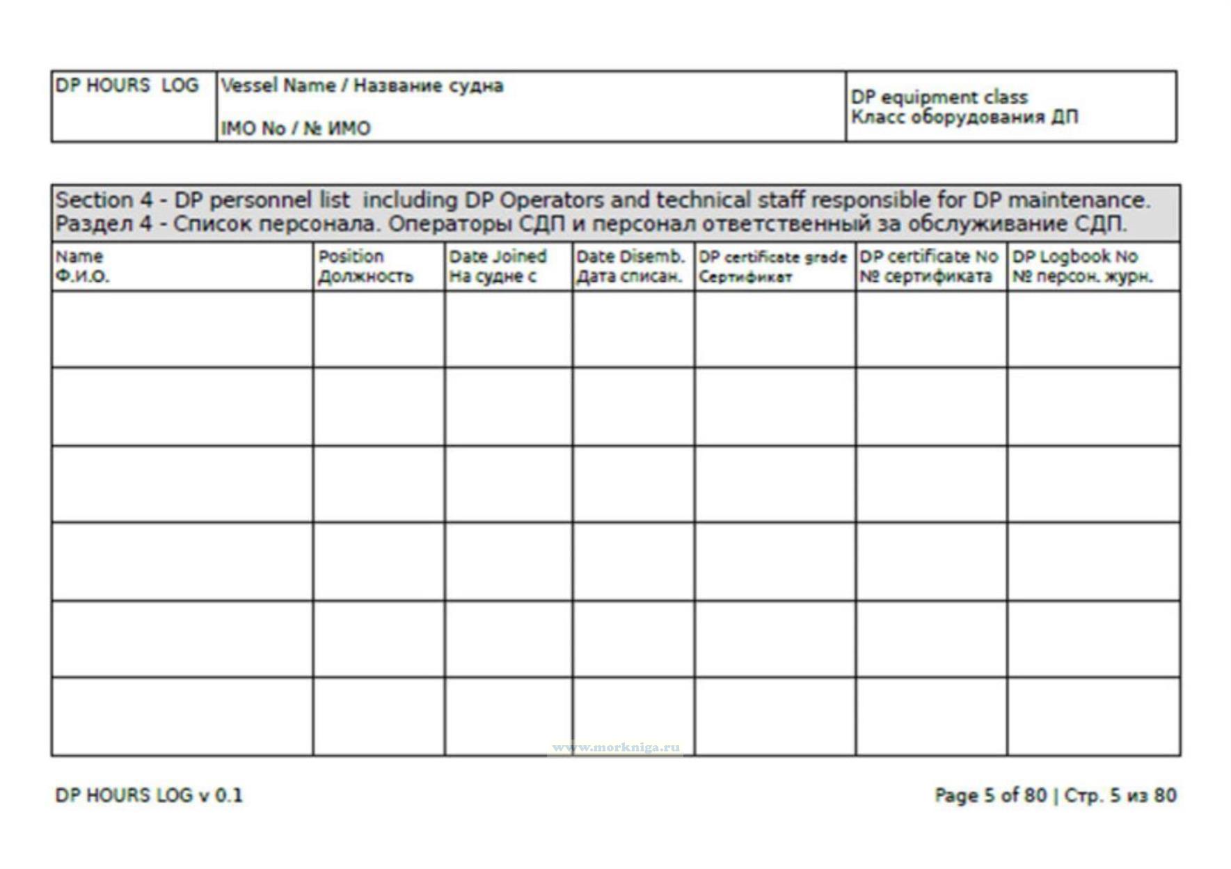 В Раздел 4 заносятся данные по судовому персоналу, вовлеченному в эксплуатацию и обслуживание системы динамического позиционирования.