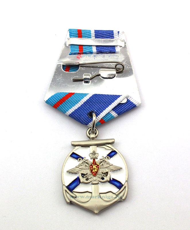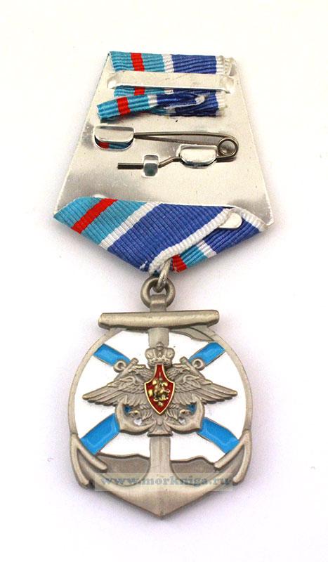 Оборотная сторона медали украшена рельефным крупным якорем, края которого выступают снизу и сверху медали, а в центре изображена эмблема ВМФ. Фоном для якоря и эмблемы является андреевский флаг.