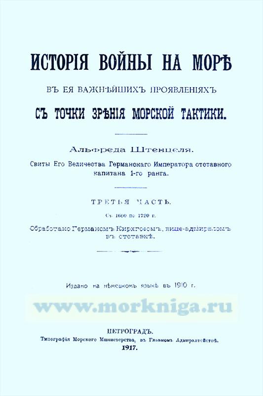 Желание восполнить этот пробел и заставило Редакцию "Морского Сборника" предпринять печатание перевода труда немецкого военно-морского писателя Альфреда Штенцеля "История войны на море в ее важнейших проявлениях с точки зрения морской тактики", вышедшего в Германии в 1907-11 гг. в 5-ти частях, уже после смерти автора, по материалам, обработанных капитаном 1 ранга Р.Дитмаром и вице-адмиралом Кирхгофом.