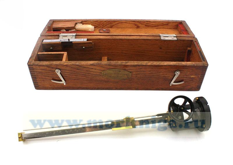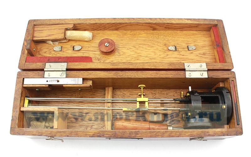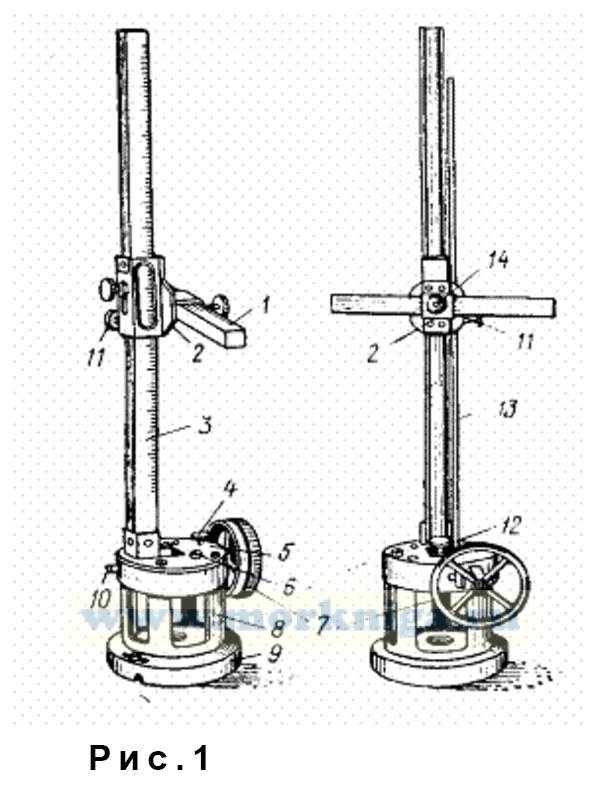 Прибор снабжен приспособлением для микрометрического перемещения измерительного магнита 1, состоящим из маховика 7, зубчатой планки 12 и штока 13. На оси маховика 7 имеется небольшая шестерня, сцепленная с зубчатой планкой. При вращении маховика планка поднимается или опускается вместе с ввинченным в нее штоком 13, который с помощью винта 11 может быть соединен с кареткой 2. При этом каретка с измерительным магнитом будет медленно перемещаться по линейке.