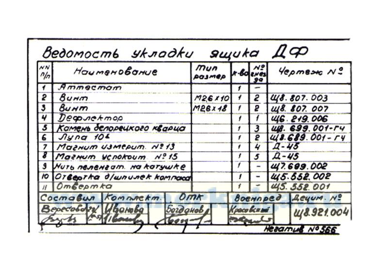 Компенсационный магнит 1 изготовляется из высококачественного магнитного материала и имеет магнитный момент 1,7 А х м2. Северный конец магнита отмечен риской. На время измерений магнит устанавливается в каретку 2, перемещающуюся по направляющей линейке со шкалой 3. Нижний конец линейки 3 прикреплен к основанию 5. В свою очередь, эта деталь крепится четырьмя винтами к стакану 8. Отверстия для винтов имеют эллиптическую форму, благодаря чему основание 5 вместе с линейкой 3 и измерительным магнитом 1 можно поворачивать на небольшие углы вокруг вертикальной оси. Такая операция выполняется во время выверки дефлектора для совмещения оси измерительного магнита 1 с визирной плоскостью пеленгатора. Поворот задается винтом 6. Стакан 8 дефлектора прикреплен к основанию 9, которое также может поворачиваться вокруг вертикальной оси, что необходимо для подгонки дефлектора к пеленгатору. Основание 9 имеет вертикальные вырезы для правильной ориентировки дефлектора относительно визирной плоскости при установке прибора на чашку пеленгатора.