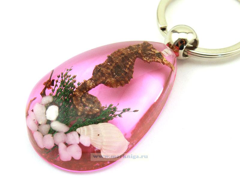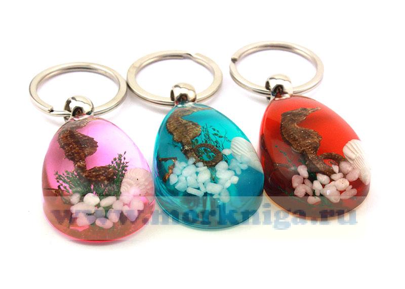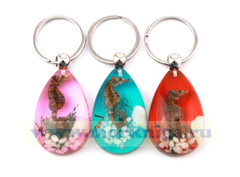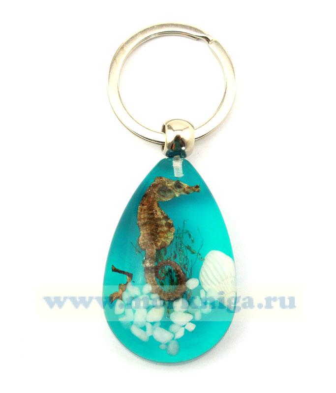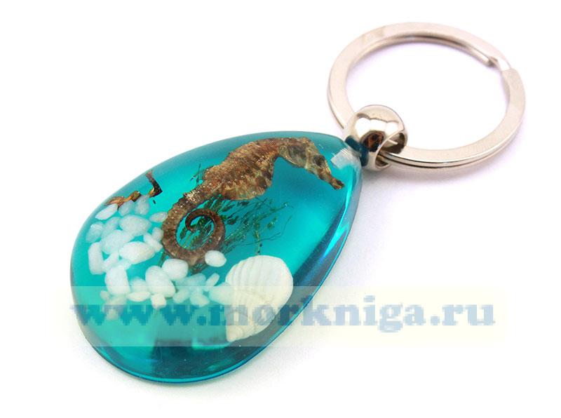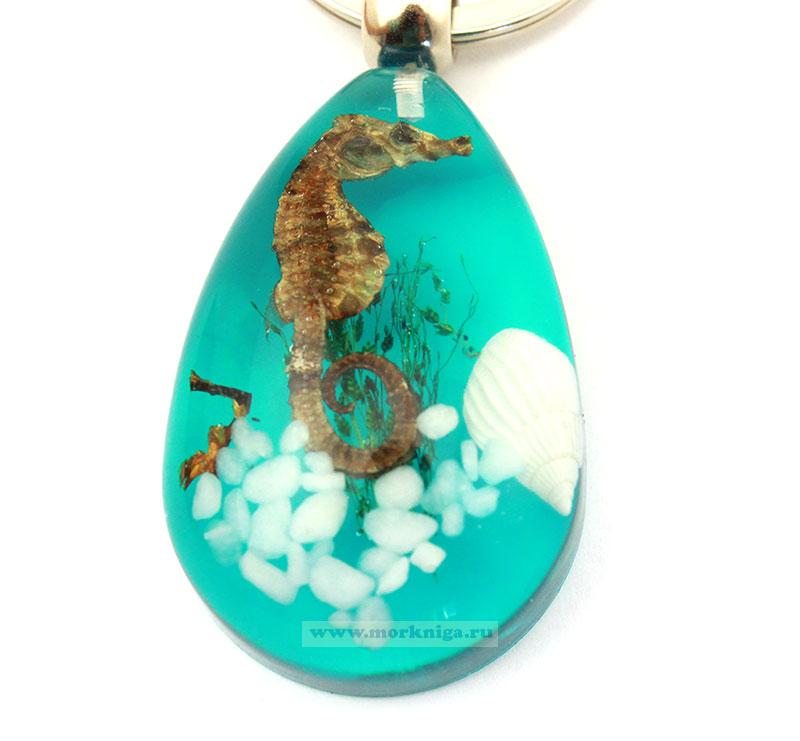 Брелок "Морской конек" - оригинальное украшение для вашей связки ключей, имеет форму капли. Кольцо большое и надежное. Морской конек, ракушка, морские камни и водоросли - настоящие, запаянные в смоле.