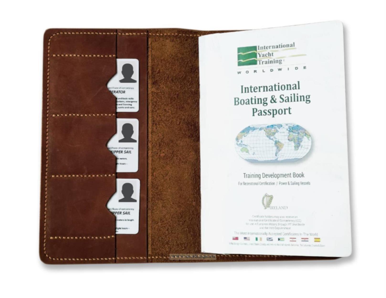 В обложку вставляется стандартный логбук (например, International Yacht Training) и карточки-сертификаты.