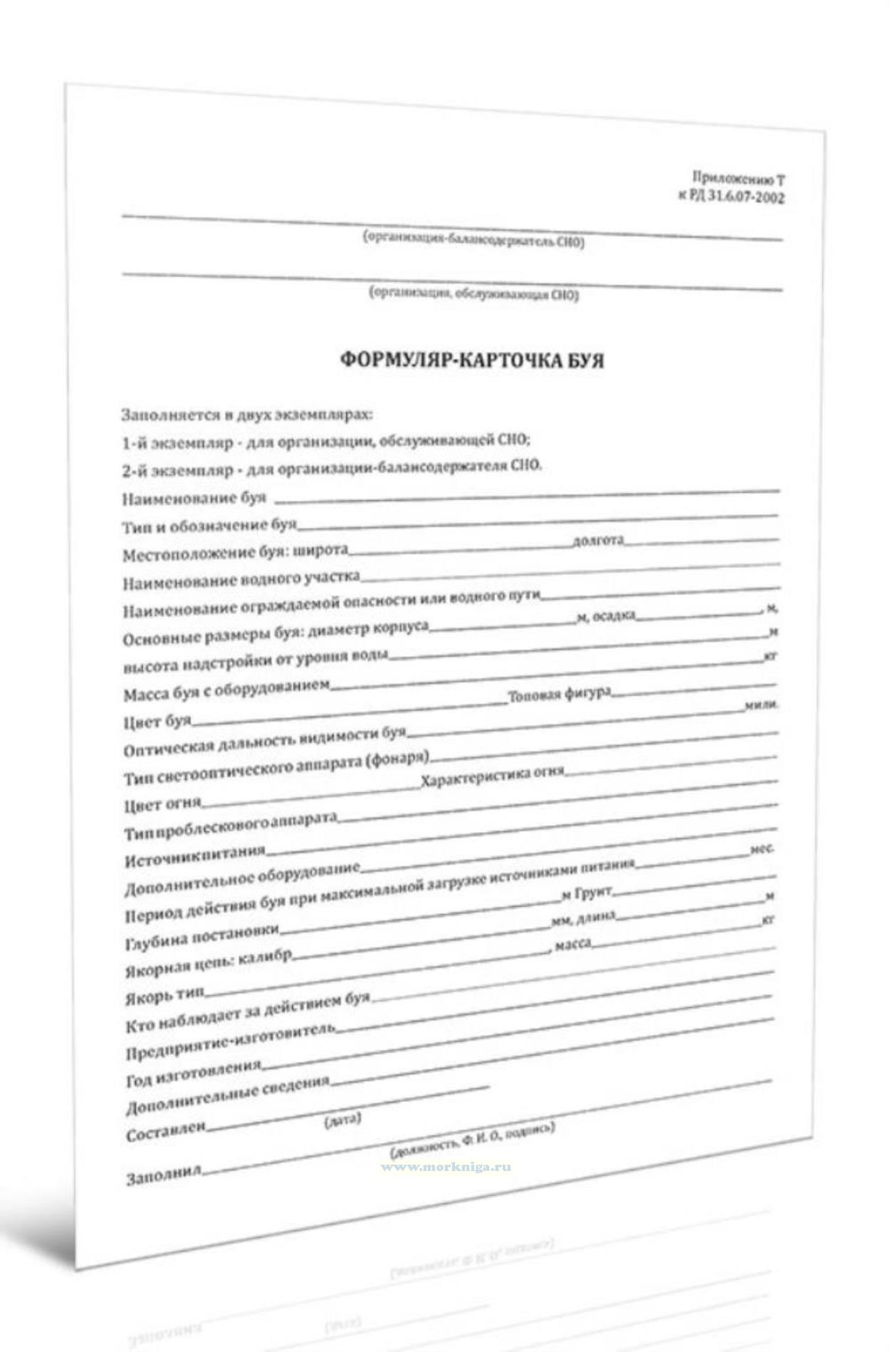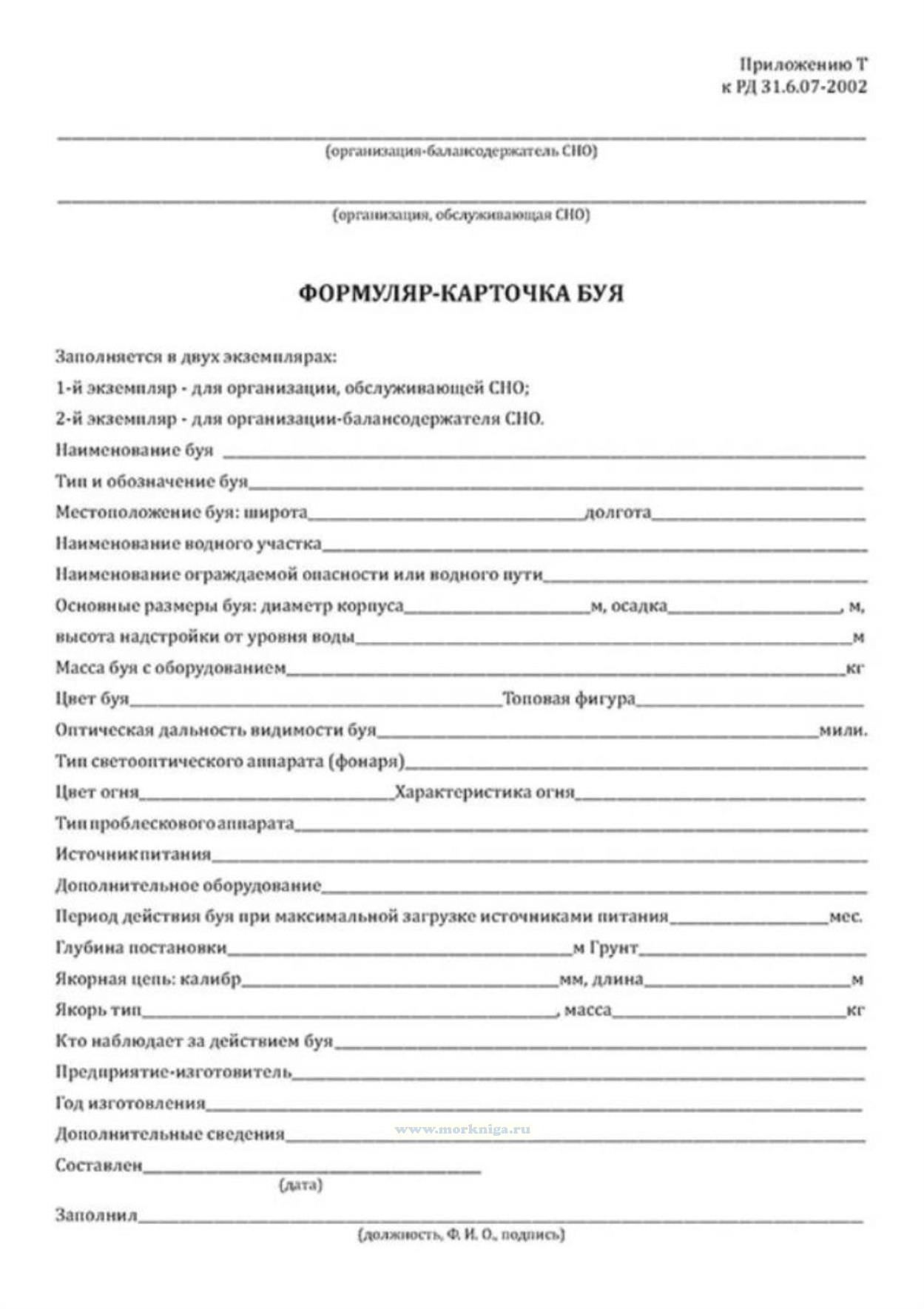 Форма Формуляра-карточки буя соответствует Приложению Т к РД 31.6.07-2002 "Инструкция по техническому обслуживанию средств навигационного оборудования морских подходных каналов и акваторий портов"