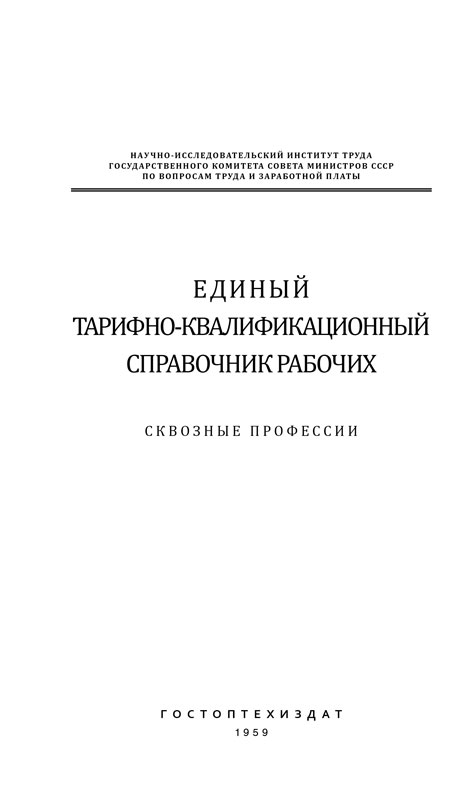 Настоящий Единый тарифно-квалификационный справочник рабочих сквозных профессий утвержден постановлением Государственного комитета Совета Министров СССР по вопросам труда и заработной платы и Всесоюзного Центрального Совета Профессиональных Союзов от 31 марта 1959 г. № 255 и является обязательным при тарификации работ и присвоении квалификационных разрядов рабочим на предприятиях, в организациях и учреждениях всех отраслей народного хозяйства независимо от ведомственной подчиненности, где имеются указанные в справочнике профессии (специальности), кроме профессий, по которым в отдельных постановлениях Государственного комитета Совета Министров СССР по вопросам труда и заработной платы или в настоящем справочнике сделаны исключения.