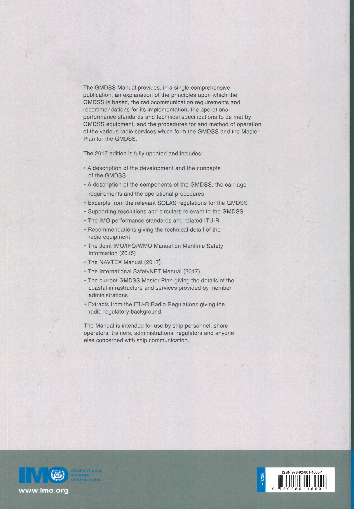 The GMDSS Manual provides, in a single comprehensive publication, an explanation of the principles upon which the GMDSS is based, the radiocommunication requirements and recommendations for its implementation, the operational performance standards and technical specifications to be met by GMDSS equipment, and the procedures for and method of operation of the various radio services which form the GMDSS and the Master Plan for the GMDSS.