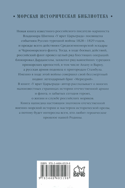 Новая книга известного российского писателя-мариниста Владимира Шигина «У врат Царьграда» посвящена событиям Русско-турецкой войны 1828—1829 годов, и прежде всего действиям Средиземноморской эскадры и Черноморского флота. Тогда, в ходе боевых действий, российский флот провел целый ряд блестящих операций: блокировал Дарданеллы, захватил ряд важнейших турецких приморских крепостей, в том числе Анапу и Варну, а русская армия подошла к пригородам Стамбула. Именно в ходе этой войны совершил свой бессмертный подвиг легендарный бриг «Меркурий».