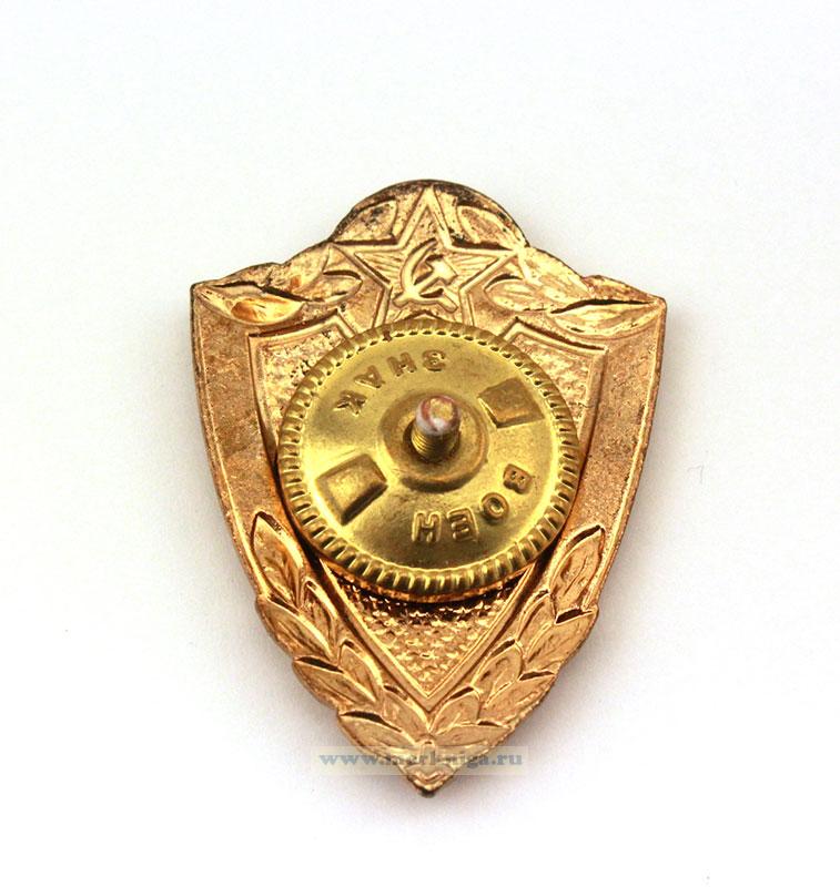 Варяжский щит со скошенными плечами и расположенной наверху окружностью, в который вписана красная пятиконечная звезда с серпом и молотом и лучеобразной насечкой под эмалью.
