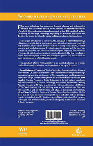 The field of fibre rope technology has witnessed incredible change and technological advance over the last few decades. At the forefront of this change has been the development of synthetic fibres and modern types of rope construction. This handbook updates the history and structural mechanics of fibre rope technology and describes the types and properties of modern rope-making materials and constructions. Following an introduction to fibre ropes, the Handbook of fibre rope technology takes a comprehensive look at rope-making materials, rope structures, properties and mechanics and covers rope production, focusing on laid strand, braided, low-twist and parallel yarn ropes. Terminations are also introduced and the many uses of rope are illustrated. The key issues surrounding the inspection and retirement of rope are identified and rope testing is thoroughly examined. The final two chapters review rope markets, distribution and liability and provide case studies from the many environments in which fibre rope is used.