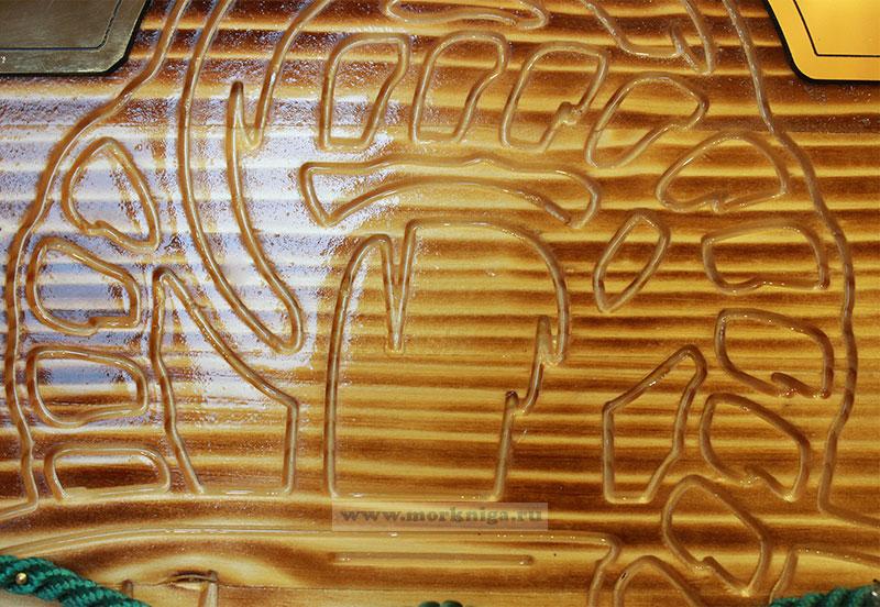 В качестве фона выгравирован адмиралтейский якорь. Дерево искусственно состарено, это придает оригинальность. Щит с внутренней стороны усилен фанерой.