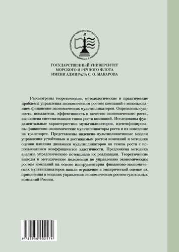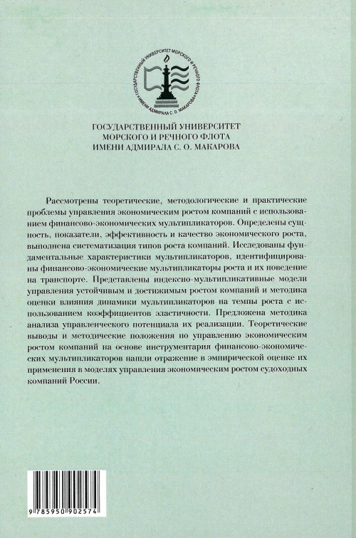Рассмотрены теоретические, методологические и практические проблемы управления экономическим ростом компаний с использованием финансово-экономических мультипликаторов. Определены сущность, показатели, эффективность и качество экономического роста, выполнена систематизация типов роста компаний. Исследованы фундаментальные характеристики мультипликаторов, идентифицированы финансово-экономические мультипликаторы роста и их поведение на транспорте. Представлены индексно-мультипликативные модели управления устойчивым и достижимым ростом компаний и методика оценки влияния динамики мультипликаторов на темпы роста с использованием коэффициентов эластичности. Предложена методика анализа управленческого потенциала их реализации. Теоретические выводы и методические положения по управлению экономическим ростом компаний на основе инструментария финансово-экономических мультипликаторов нашли отражение в эмпирической оценке их применения в моделях управления экономическим ростом судоходных компаний России. Предназначено для студентов, аспирантов, преподавателей и научных работников, а также специалистов, реализующих стратегию экономического роста компаний.